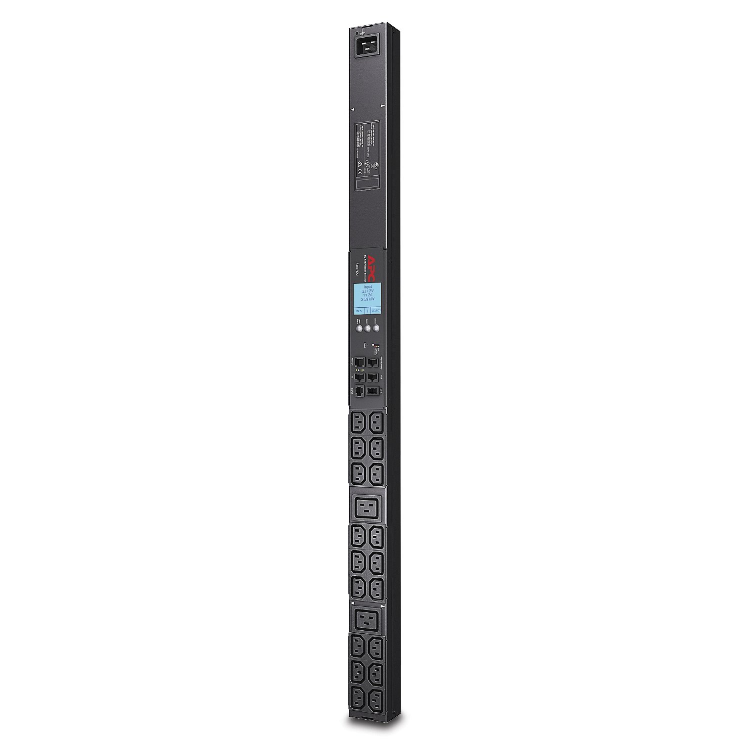 APC Metered Rack PDUs offer resilient power distribution and actively measure, display, and log volts, amps, real power (kW) & energy (kWh). This PDU offers LCD display, real-time remote monitoring and user-defined alarms to help prevent circuit overloads that can cause accidental power loss to critical equipment. Historical reporting enables users to meter customer power usage, optimize energy use as well as plan for capacity . This zeroU PDU can operate at up to 60 degrees Celsius and can be accessed, configured, and managed remotely via EcoStruxure IT, Web, SNMP and Command Line Interface. Power is supplied to the PDU at 220-240 volts via IEC C20 inlet (no cord provided) while power comes out at 100-230 volts through (18) C13 and (2) C19 locking outlets. It integrates with EcoStruxure IT, and daisy-chaining is supported to monitoring up to 4 PDUs from 1 IP address as well as a local USB port for easy local firmware updates As a Green Premium product, this unit comes with a verified product environment profile, including carbon footprint, scope 3 emissions and end of life instructions.